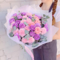 Букет из розовых роз и белых гортензий в упаковке