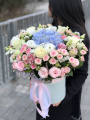 Букет из розовой гортензии, оранжевых роз и розовых гвоздик