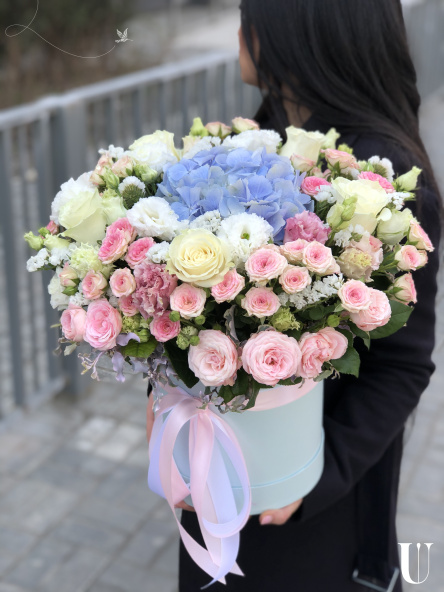 Эустома, пионовидные розы , кустовые пионовидные кустовые розы, статица , гортензия, розы, зелень