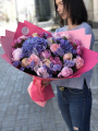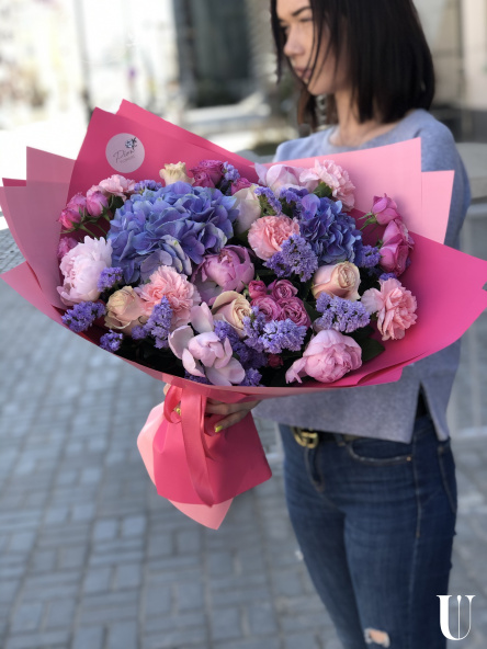 Пионы , гортензии , статица , пионовидные кустовые розы, одноголовые розы, гвоздики, зелень.
