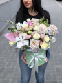 Авторский букет из роз, диантусов и сантини в розовой упаковке