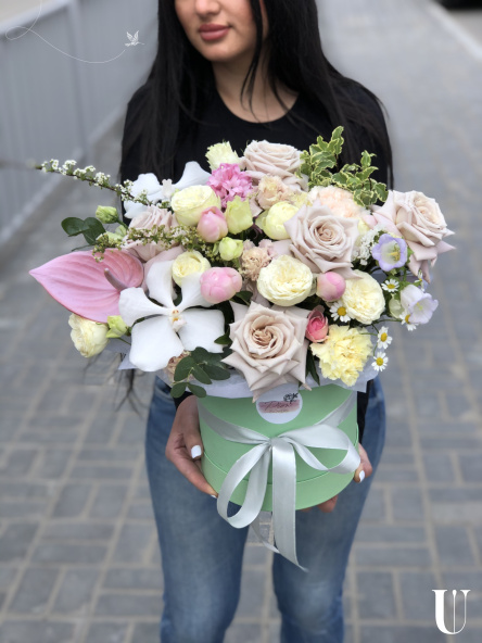 Антуриум , Ванда, розы,ромашки, пионовидные кустовые розы ,гвоздики , колокольчики , пионы , зелень .