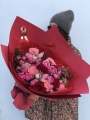 Шикарный букет из розовых кустовых хризантем, белых гербер и розовых кустовых роз в дизайнерской упаковке