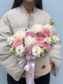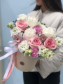 Классический букет из розовых роз и белых диантусов в стильной упаковке