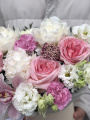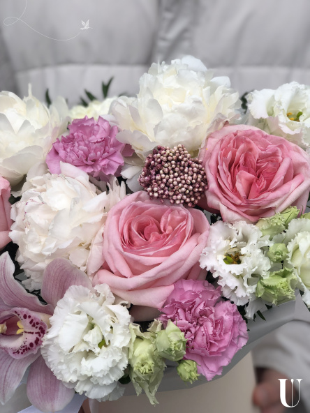 Роскошный букет в розовых тонах из роз, орхидеи и альстромерий в розовой упаковке