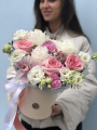Шикарный букет из розовых кустовых хризантем, белых гербер и розовых кустовых роз в дизайнерской упаковке