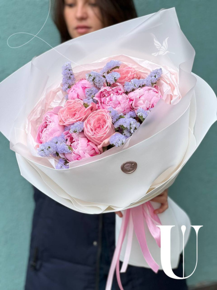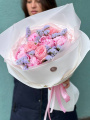 Авторский букет из роз, диантусов и сантини в розовой упаковке