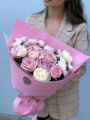 Классический букет из розовых роз и белых диантусов в стильной упаковке