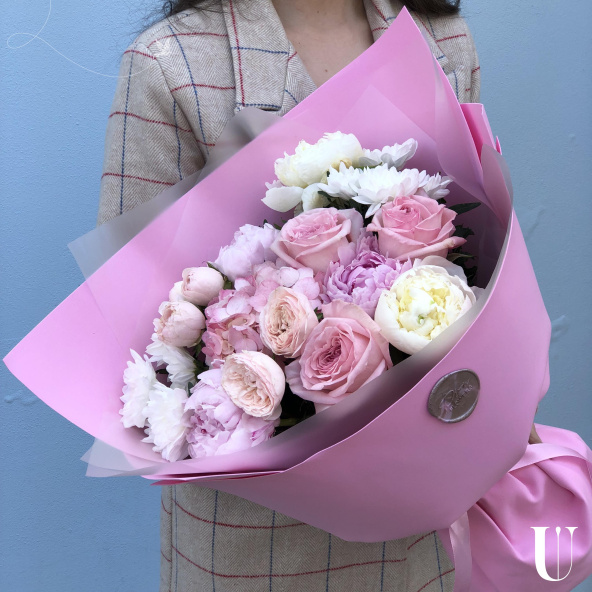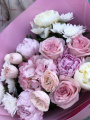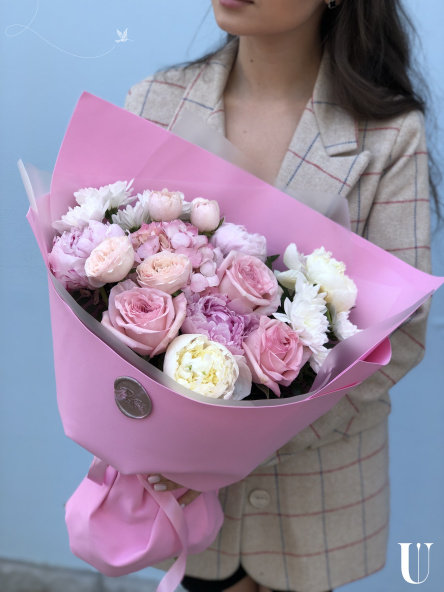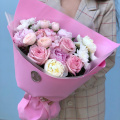 Шикарный букет из розовых кустовых хризантем, белых гербер и розовых кустовых роз в дизайнерской упаковке