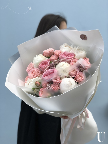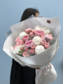 Авторский букет в розовых тонах из гортензий и роз в стильной упаковке