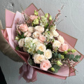 Авторский букет из роз, диантусов и сантини в розовой упаковке