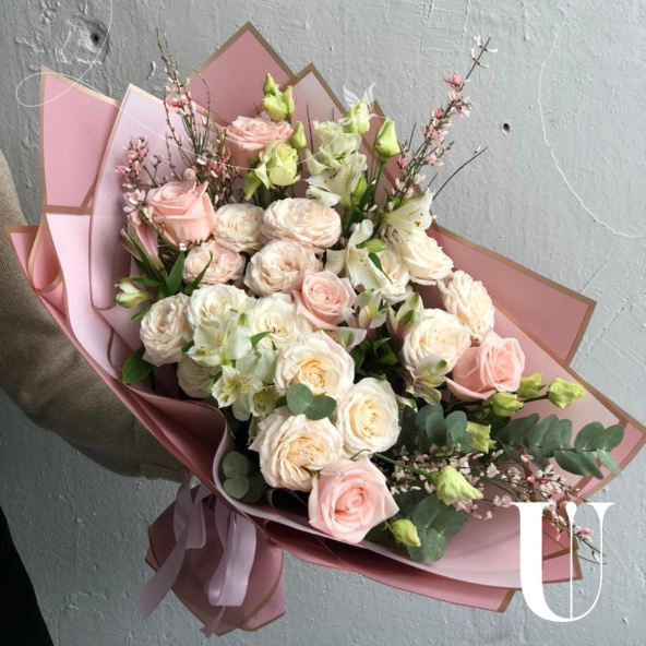 3 альстромерии , 4 ветки пионовидных кустовых роз, эвкалипт, 5 роз пинк мондиал, 4 ветки эустомы.