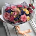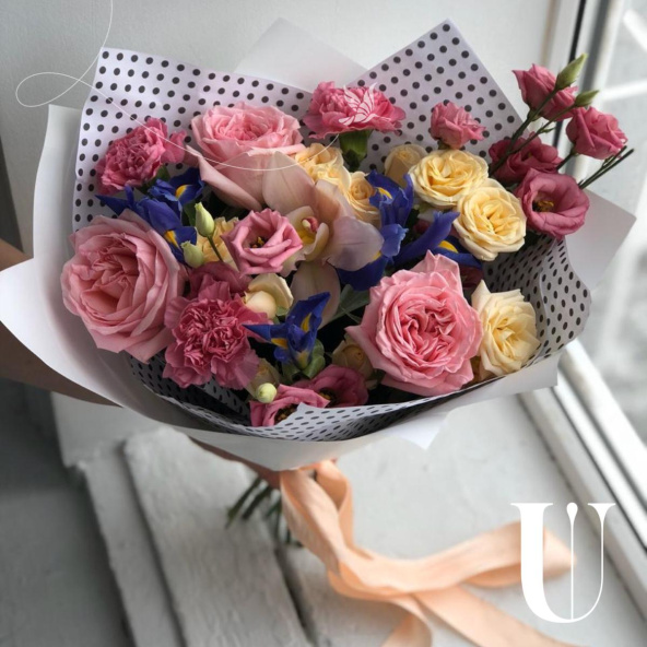Пионовидные Розы 3 шт, эустома 2 ветки , ирисы 7 шт, кустовые Розы 3 ветки , орхидея 1 шт, гвоздики 3 шт
