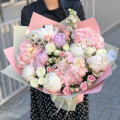 Букет из розовой гортензии, оранжевых роз и розовых гвоздик