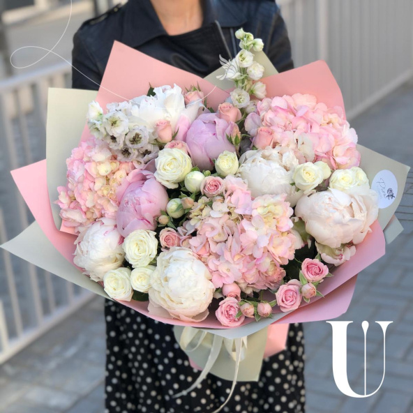 Стильный букет в розовой дизайнерской упаковке