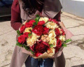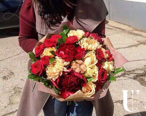 Авторский букет в красно-розовых тонах из роз, диантусов и герберы в бордовой упаковке