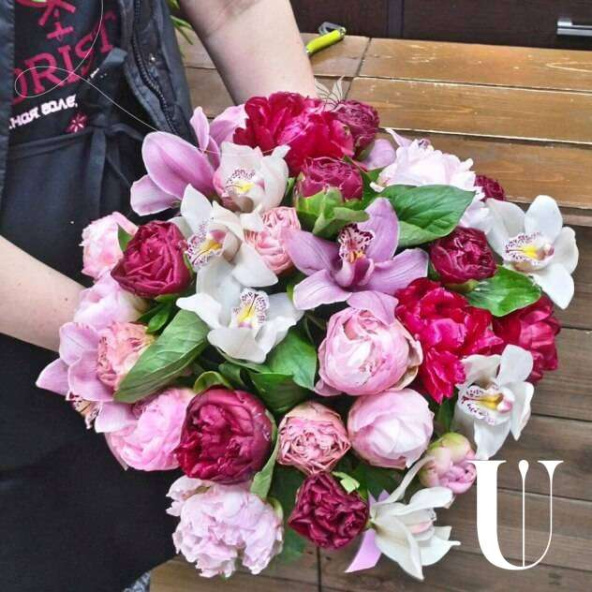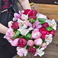 Большой букет из нежной гортензии, розовых кустовых роз Бомбастик и красных роз сорта Ред Наоми