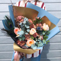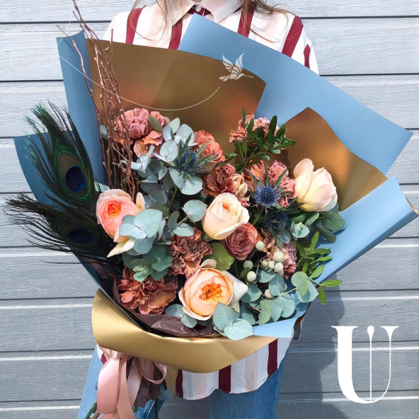 - Гвоздика 7 шт, роза пионовидная 4 шт, роза капучино 3 шт, эрингиум 2 шт, бруния 1 шт,эвкалипт 2 шт, пистаж 3 шт,перья 2 шт, упаковка дизайнерская 1 шт, лента 2 шт, ветки крашеные 3 шт