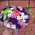 - А яркость фиолетовой эустомы, в сочетании с нежной розой, салатовой одноголовой хризантемы, хризантем микс и пепельного эвкалипта - подарит отличное настроение!!)))