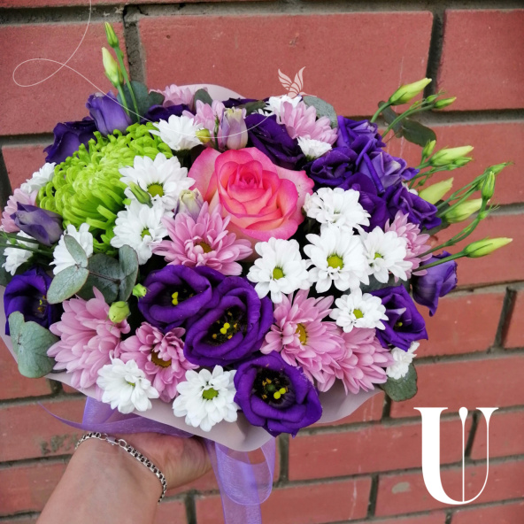 - А яркость фиолетовой эустомы, в сочетании с нежной розой, салатовой одноголовой хризантемы, хризантем микс и пепельного эвкалипта - подарит отличное настроение!!)))