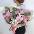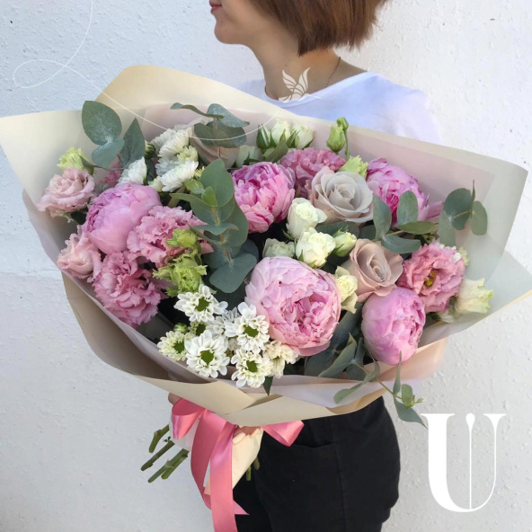 Пион сара бернар - 5 шт. эвкалипт - 5 шт. эустома - 5 шт. роза эквадор - 4 шт. сантини - 2 шт. роза кустовая - 2 шт. матовая пленка- 3 шт. лента атласная - 2 шт