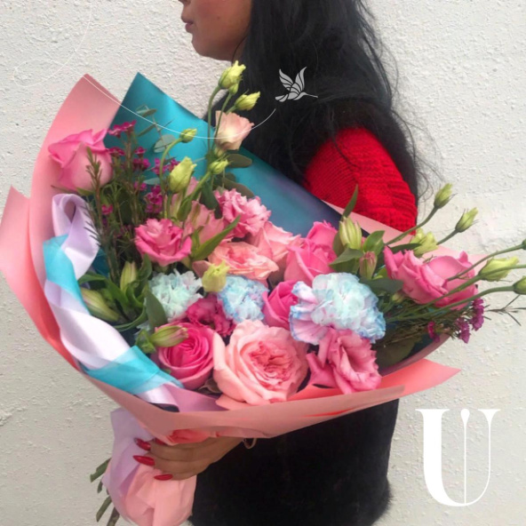 Роза местная - 6 шт. упаковка дизайнерская - 3 шт. пинк охара - 3 шт. гвоздика - 3 шт. лента атласная - 2 шт. эустома - 2 шт. хамелациум - 1 шт. эвкалипт - 1 шт