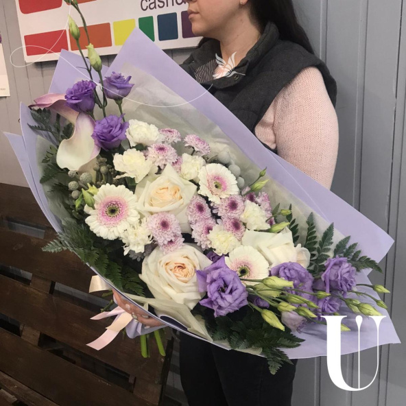 Гвоздика - 6 шт. папоротник - 4 шт. хризантема кустовая - 3 шт. white o'hara - 3 шт. гермини - 3 шт. бруния сильвер - 2 шт. тишью - 2 шт. фоамиран (упаковка) - 2 шт. калла - 2 шт. эустома - 2 шт. лента атласная - 1 шт