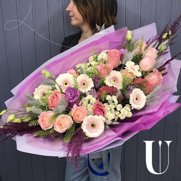- Лагурус (сухоцвет) - 25 шт. роза эквадор - 13 шт. гермини - 7 шт. сантини - 5 шт. тласпи - 3 шт. фоамиран (упаковка) - 3 шт. целозия - 2 шт. эустома - 2 шт. картадерия - 2 шт. тишью - 2 шт. лента атласная - 2 шт