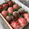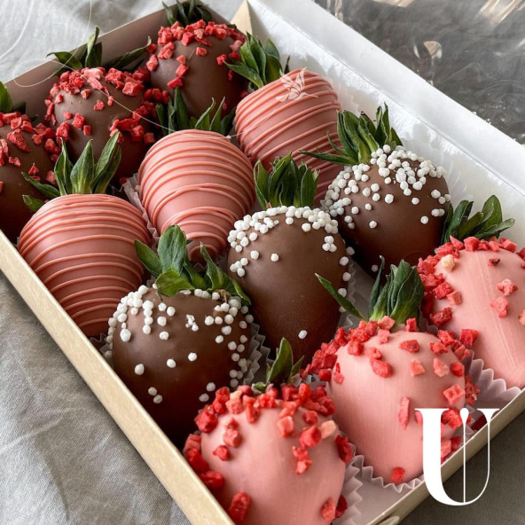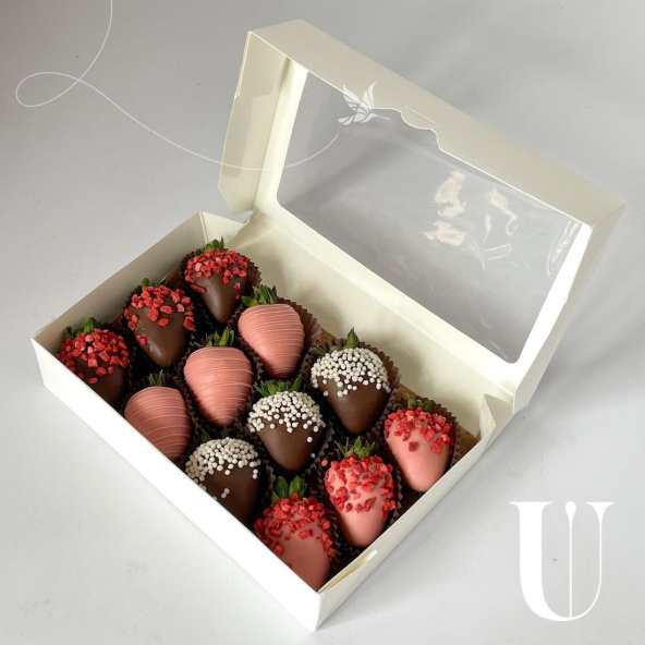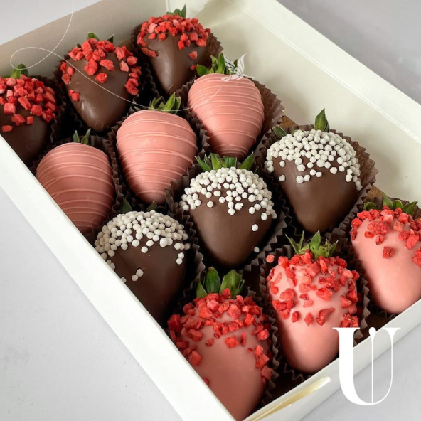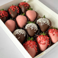 Набор клубники в молочном и белом шоколаде, украшенной сублиматом и кондитерской посыпкой.