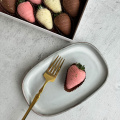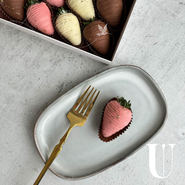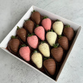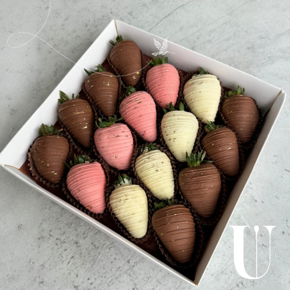 Набор клубники в белом и молочном шоколаде, украшенный золотым кандурином.