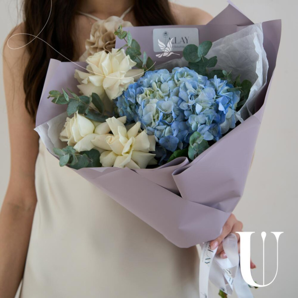 Встречайте наш новый авторский букет, созданный вдохновенным дизайнером специально для вас. Это великолепное сочетание роз, гортензий и эвкалипта призвано придать вашему особому дню неповторимую красоту и элегантность. Розы, символизирующие любовь и страсть, дарят букету яркость и энергию. Гортензии, в свою очередь, приносят нотки изысканности и нежности, а эвкалипт добавляет свежести и аромата.