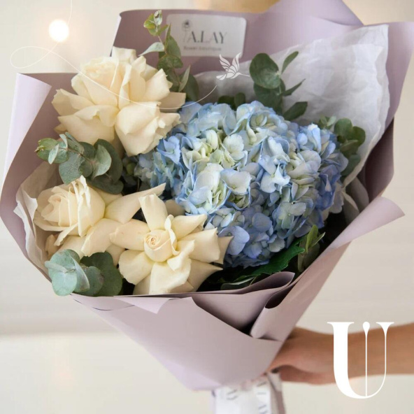 Дарите удивление и восхищение с нашим эксклюзивным авторским букетом из роз, гортензий и эвкалипта. Это идеальный подарок для тех, кого вы цените и любите, а также прекрасное дополнение к особым событиям вашей жизни. Позвольте себе окунуться в мир красоты и элегантности с нашими уникальными цветами, которые будут радовать вас и ваших близких долгие годы.