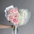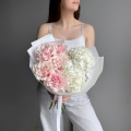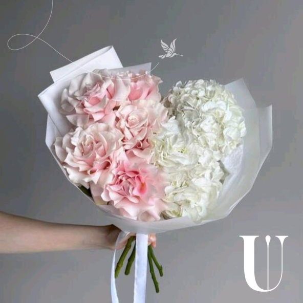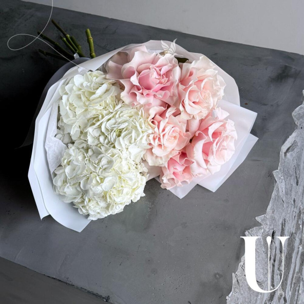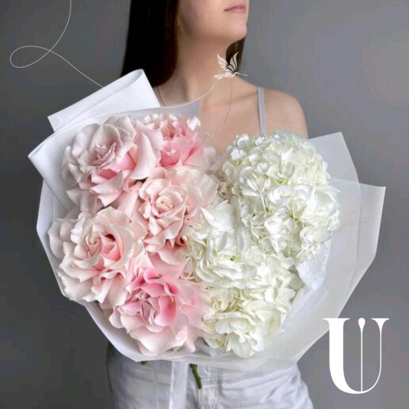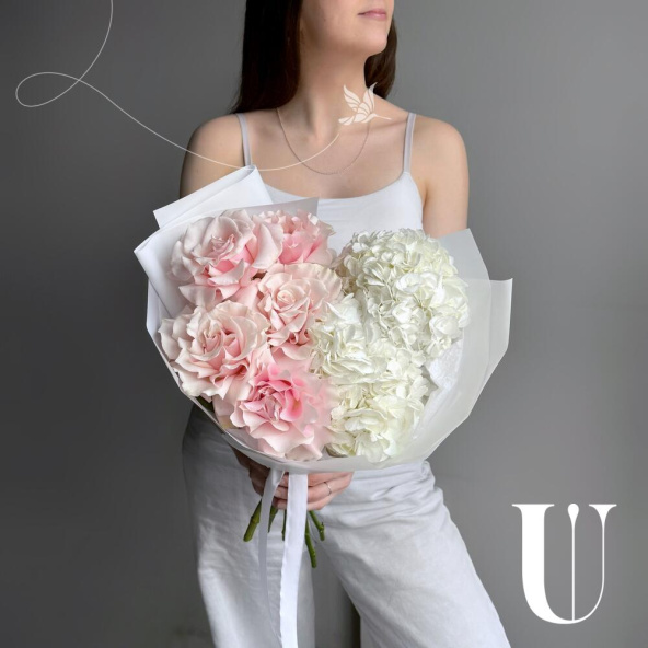 Нежный букет в пастельных тонах из красивейших розовых французских роз и белой гортензии.