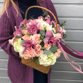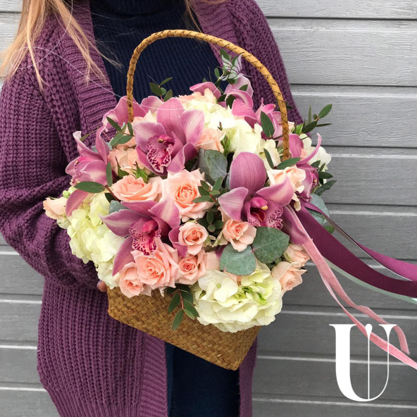 Орхидея 8 шт, гортензия 2 шт, кустовая роза 8 шт, эвкалипт 2 шт, корзина 1 шт, оазис 1 шт