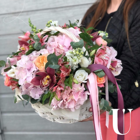 - Летний палисадник в одной корзине с нотками экзотики,ароматнейшие розы,невероятная маттиола, изумительная альстромерия и воздушная гортензия в сочетании экзотической,столь же ароматной орхидеи❤️