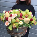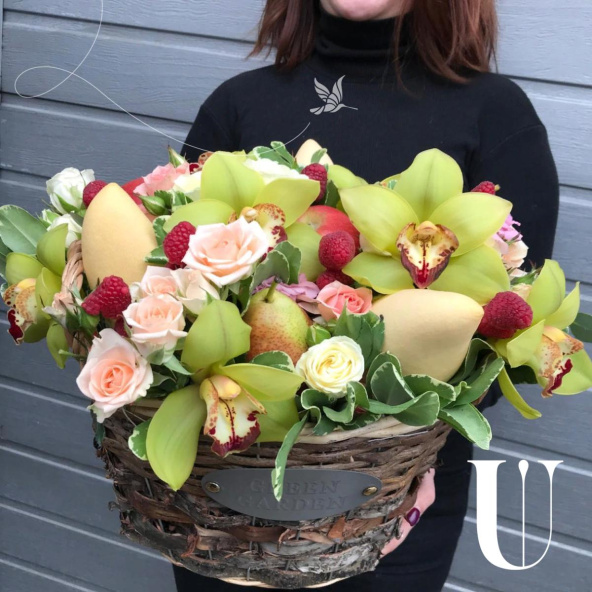 Малина - 15 шт. питоспрум - 5 шт. роза кустовая - 5 шт. орхидея цимбидиум - 5 шт. яблоко - 3 шт. манго тайское - 3 шт. груша - 3 шт. оазис флористический - 2 шт. корзина плетеная - 1 шт. агапантус - 1 шт