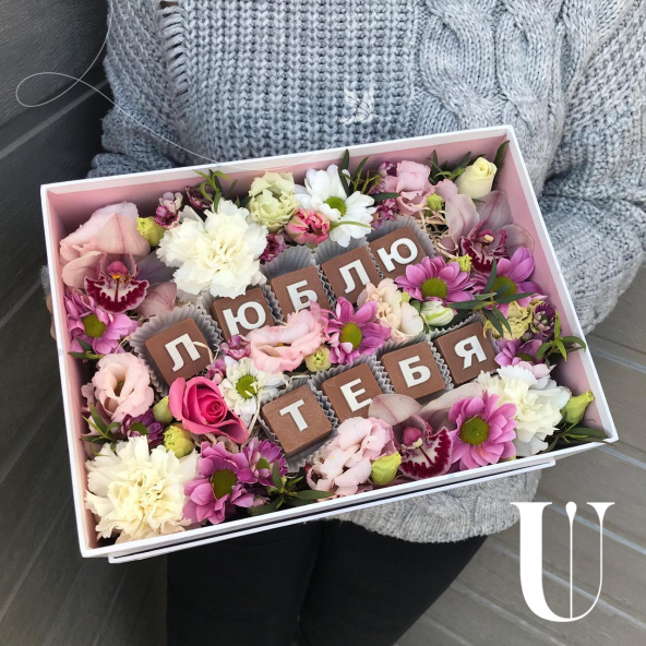 - Нежнейшая романтичная цветочная композиция в тематической коробке с вкуснейшим шоколадом ручной работы