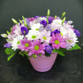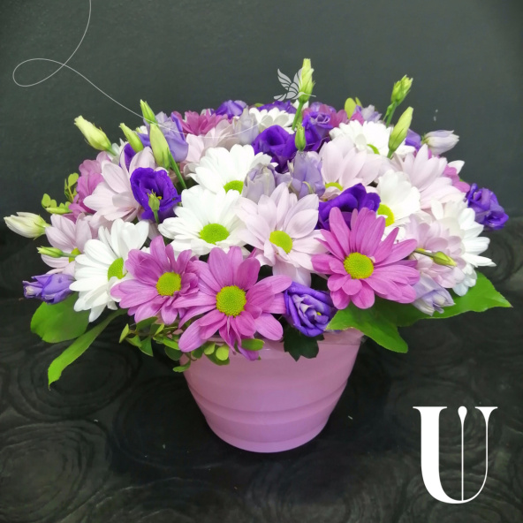 Такая яркая и в тоже время нежная цветочная композиция из фиолетовой эустомы и различных хризантем с добавлением зелени...))