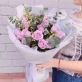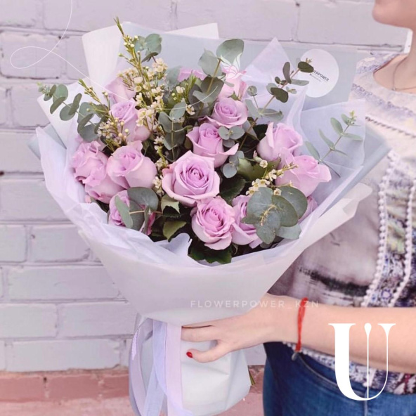 Невероятные оттенки сиреневых роз в сочетании в припудренным эвкалиптом в стильном светлом оформлении