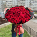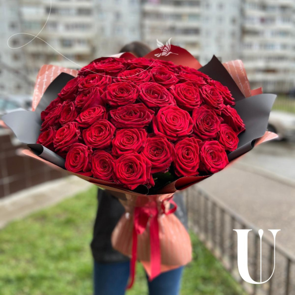Монокомпозиция из 11 красных роз в розовой упаковке