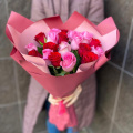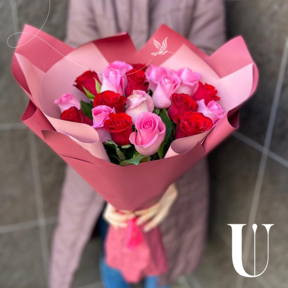 Монокомпозиция из 11 красных роз в розовой упаковке