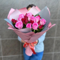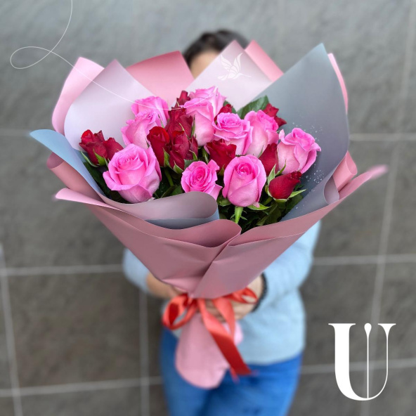 Монокомпозиция из 11 красных роз в розовой упаковке