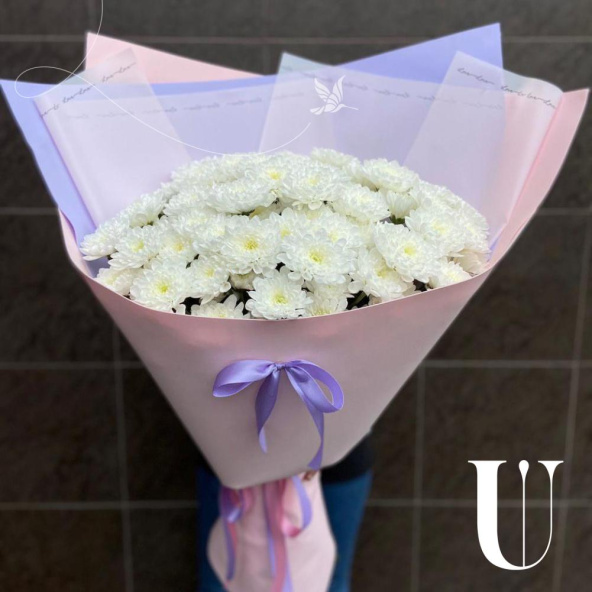 Букет гигант из 11 веток кустовой хризантемы в стильной упаковке перевязанный атласной лентой долго будет радовать Вас и Ваших близких!