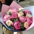 6 роз одноголовых,7 пионов,пучок зелени.