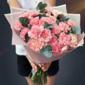 Букет "Грейта" из розовых гвоздик с эвкалиптом в матовой пленке с атласной лентой - это стильный и изысканный подарок, который подойдет для любого повода. В составе букета 25 розовых гвоздик, которые символизируют собой благодарность, заботу и уважение, и ветви эвкалипта, которые добавляют свежести и завершают нежный образ букета.