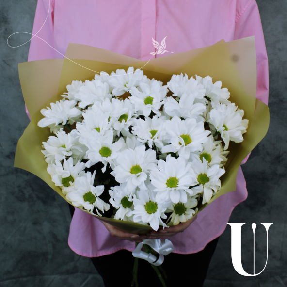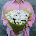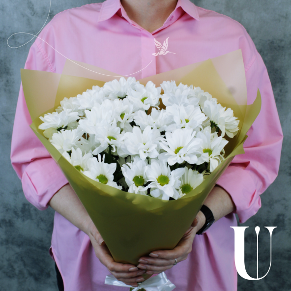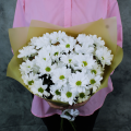 Букет из 5 белых кустовых ромашковых хризантем в матовой пленке с атласной лентой — это отличный выбор для тех, кто хочет подарить радость и тепло близким людям.