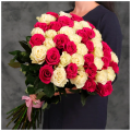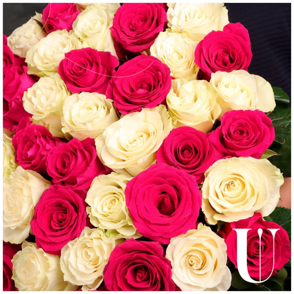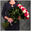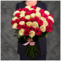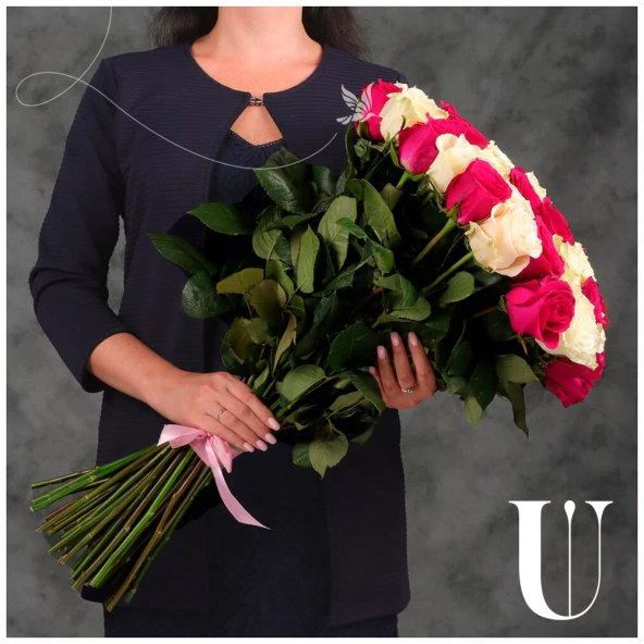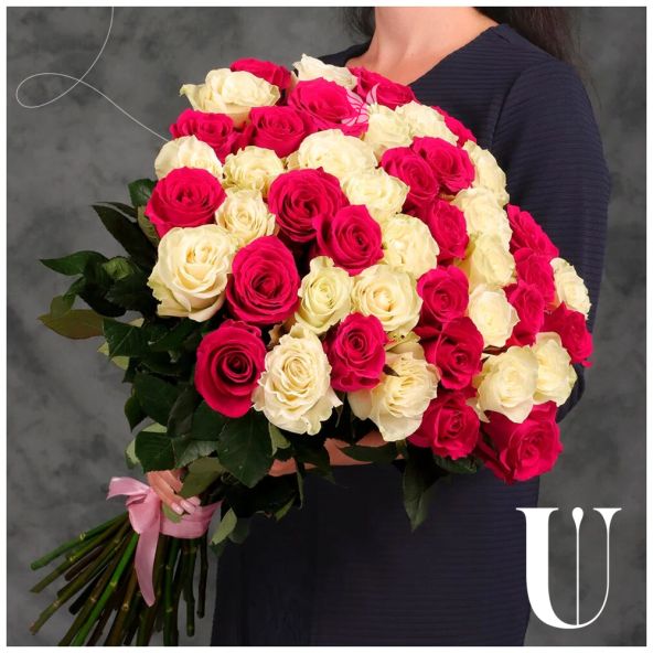 Букет из 45 белых и розовых Эквадорских роз микс 60 см с атласной лентой - это стильный и элегантный подарок, который подойдет для любого повода. В составе букета розы сорта Мондиаль и Пинк Флойд – это высококачественные цветы, которые известны своими насыщенными оттенками и приятным ароматом, который будет радовать вас и ваших близких.