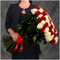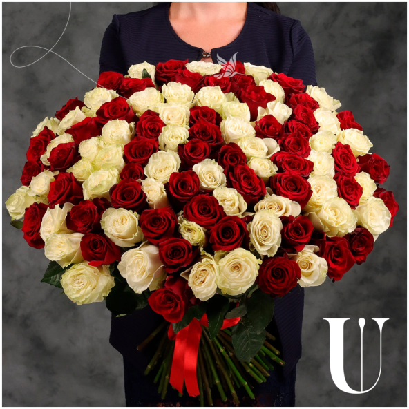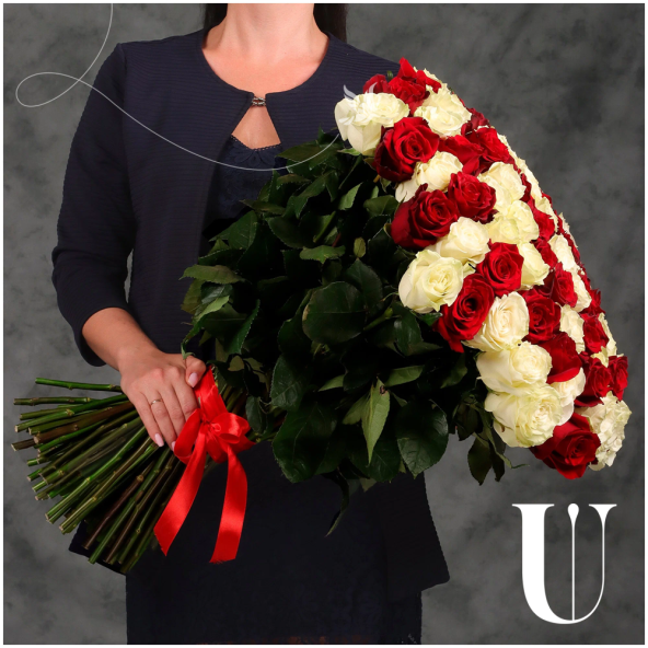 Букет из 101 красной и белой Эквадорской розы микс 60 см с атласной лентой - это стильный и элегантный подарок, который подойдет для любого повода. В составе букета розы сорта Эксплорер и Мондиаль – это высококачественные цветы, которые известны своими насыщенными оттенками и приятным ароматом, который будет радовать вас и ваших близких.