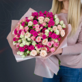 Классический букет из 25 разноцветных кустовых роз микс в матовой пленке с атласной лентой - это стильный и элегантный подарок, который подойдет для любого повода. Разноцветные кустовые розы белого и розового оттенков в составе букета отличаются повышенной пышностью и объёмностью бутона, а композиция из них выглядит утонченно и изысканно.