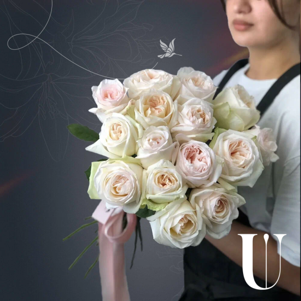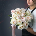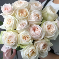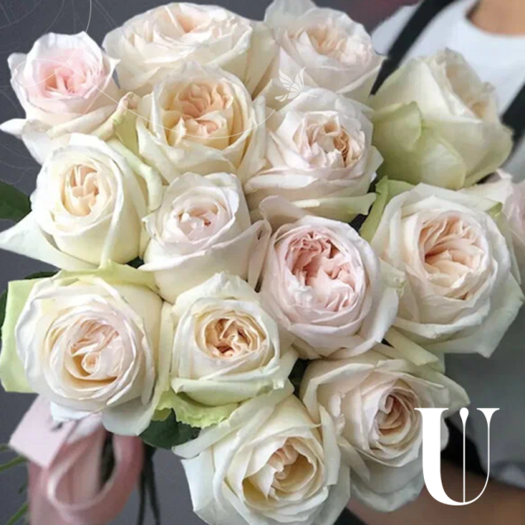 Монобукет из 15 пионовидных роз сорта White O'Hara с атласной лентой - это изысканный и стильный подарок, который станет незабываемым сюрпризом для любого торжества или особого случая. Роскошные пионовидные розы White O'Hara в составе букета обладают крупным бутоном с пышными многослойными лепестками и насыщенным медовым ароматом.
